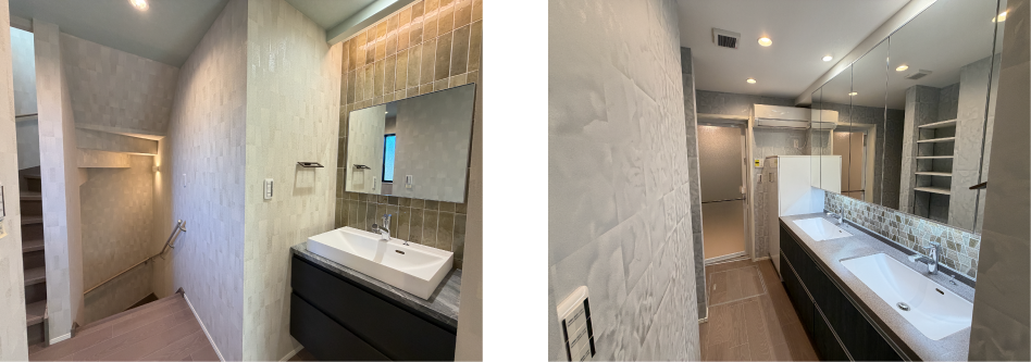 洗面台やお手洗いの壁面にガラスタイルを贅沢に使用し、デザイン性と存在感を高める仕立てとなっています。